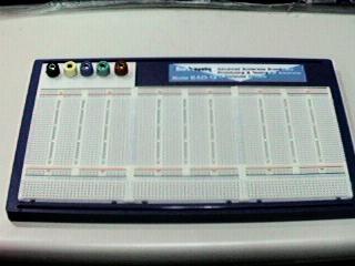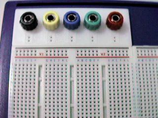 ブレッドボードは電線を差し込む穴がたくさんあいている配線板 です.溝や印があるところまで横方向に並ぶ穴は内部で導通して います.