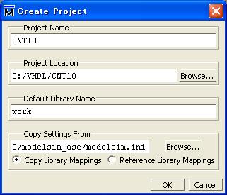 「C:/VHDL/CNT10」というフォルダに保存するように指示している。Copy Setting Fromについてはそのままでよい)